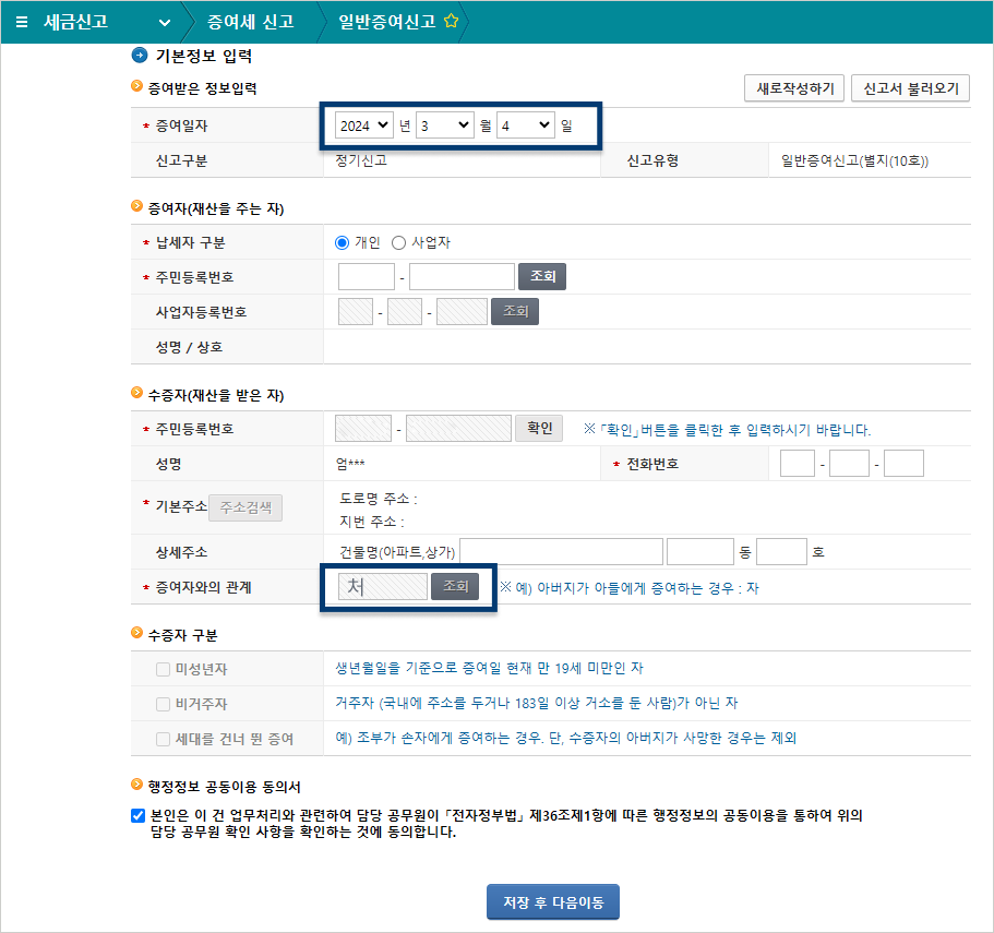 ②증여자와의 관계: 수증인이 배우자이면 ‘처’ 자녀면 ‘자’(예시: ‘처’)