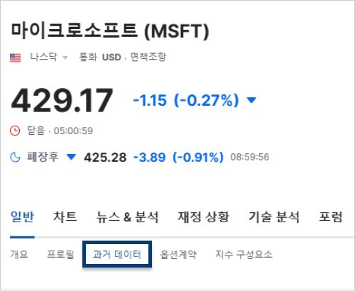 : 인베스팅닷컴> 검색창에 증여할 주식 입력 >일반> 과거 데이터