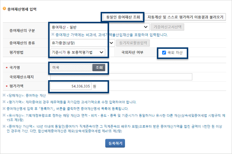 ⑧평가액: 증여자산의 평가액 (예시 : 54,336,335원)