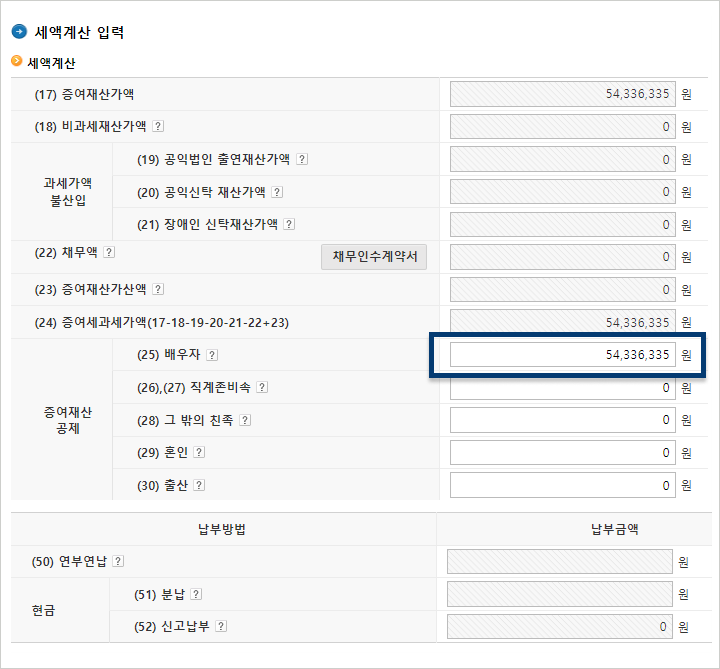 ⑪증여재산공제: 수증인란에 평가액 직접 수기 입력 (예시: 54,336,335원)
