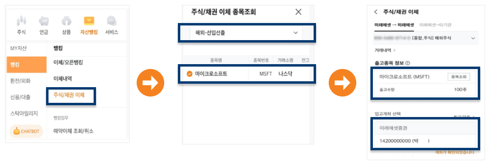 ①화면 왼쪽 아래 메뉴 > 자산뱅킹 > 뱅킹 > 주식/채권이체 선택