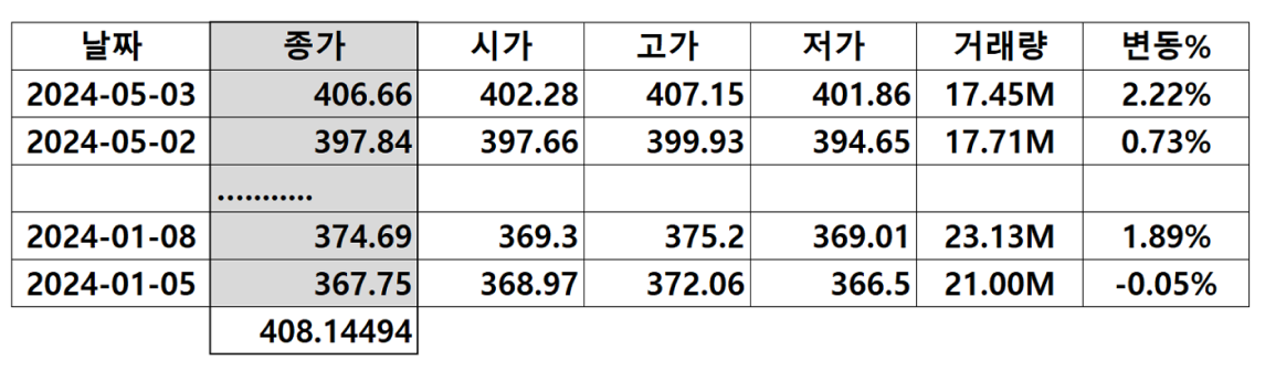 (중간에 휴일 등은 무시하고 조회되는 일자의 종가를 평균)