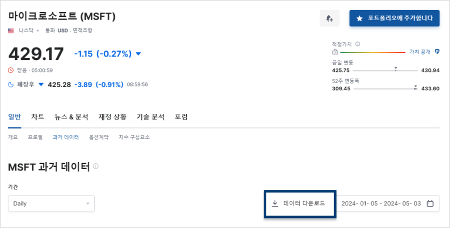 : ‘2024년 1월 5일 ~ 2024년 5월 3일’ 입력 후 데이터 다운로드 클릭 > 해당 자료에 대한 엑셀 자료 생성